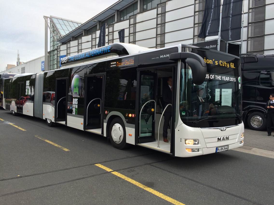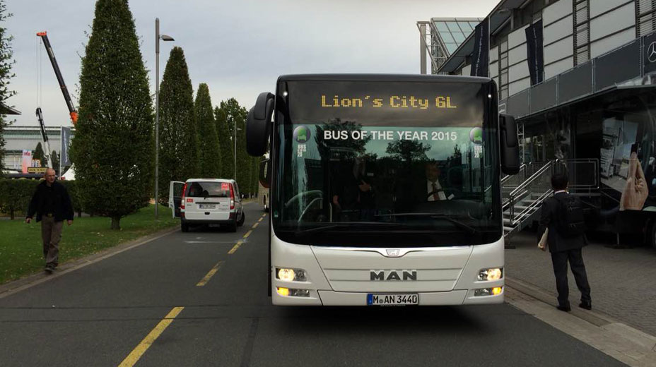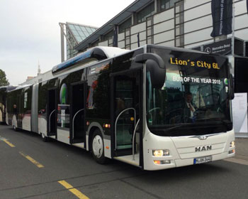 中国客车英文网[www.chinabuses.org]: 德国当地时间23日晚上7点,第64届IAA汉诺威商用车展开幕晚宴在汉诺威国际展览中心拉开序幕。晚宴公布“2015年度巴士”大奖归属:来自德国曼Lion's City GL CNG铰接式城市客车。18.75米的德国曼Lion's City GL天然气驱动铰接式城市客车全力以赴,成功问鼎“2015年度巴士”桂冠。 City GL主要适用于城市公交运输,最多可承载142名乘客。该款客车的一个亮点在于,共有五组双侧车门,成为客车市场上的唯一 ...【详细】