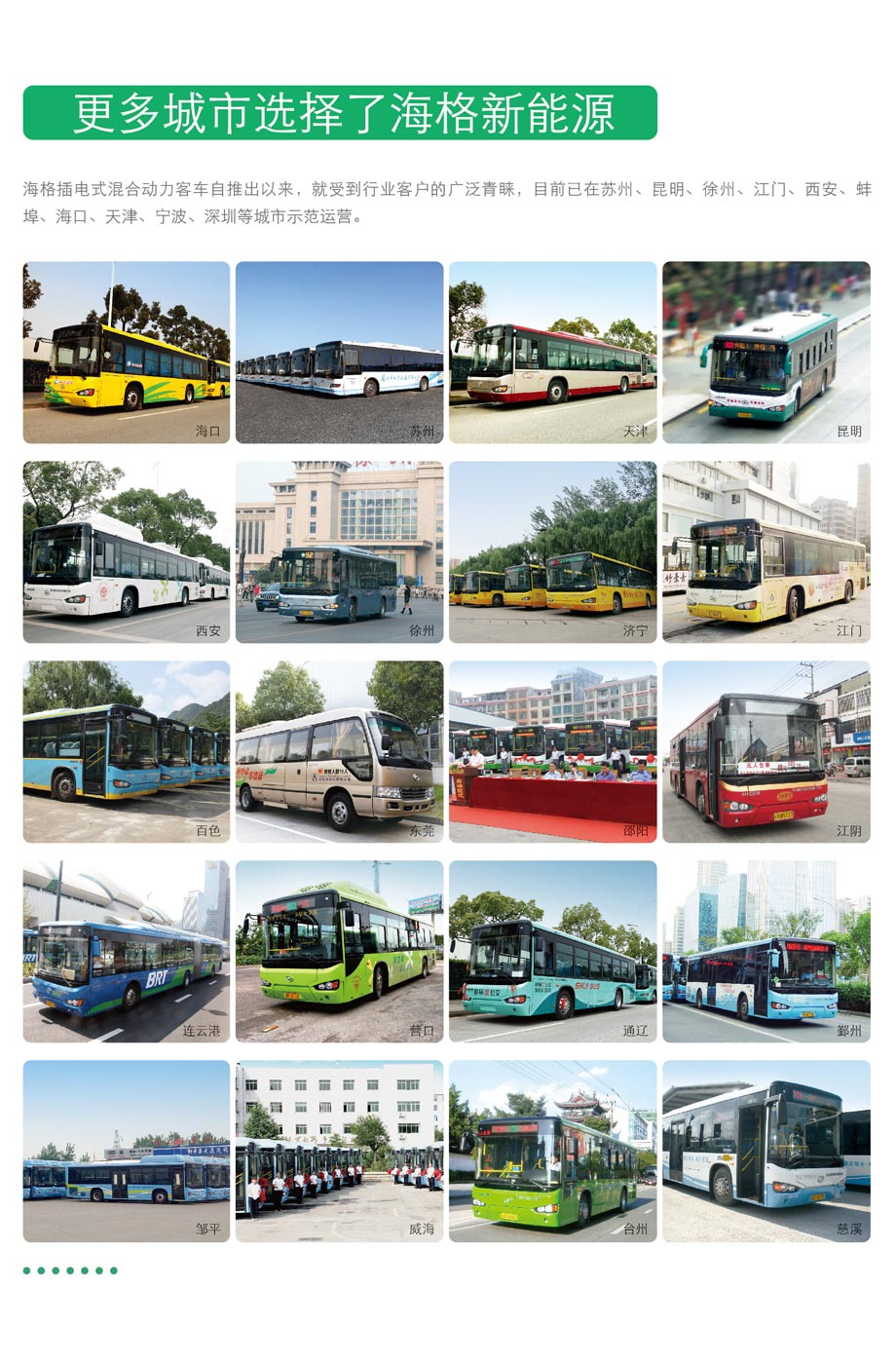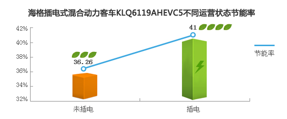 海格新能源客车在苏州吴中公交——在505路试运营的海格KLQ6119GAHEVC5插电式混合动力公交车插电情况下节能超40%。2014年1月7日至1月14日,海格插电式混合动力公交投入苏州吴中公交505线路试运营,从越溪首末站至灵岩山首末站,该线路共41个站点,每日运行212公里。经试用,未插电式情况下,平均百公里气耗为22.03公斤(运行里程1272公里,总气耗280.21公斤),与同线路11.5米LNG公交比较(百公里气耗为34.56公斤),节气率达到36.26%,插电情况下,百公里气耗为20.39公斤,节气率达 41%。”