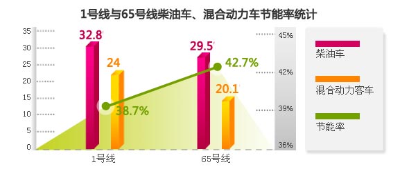海格新能源客车在徐州公交——徐州公交副总经理王宇宙表示:“在徐州公交,混合动力公交作为一个新鲜事物,从驾驶员、修理工到管理层当初都一无所知,海格对我们进行了一系列的培训,从使用到维修效果都很好,为正常运营奠定了基础。” 据徐州公交提供的运营数据显示,仅1号线38辆海格新能源客车在去年9、10、11月的燃料成本与去年同期普通柴油车相比,共节能655604元。以此测算,全部的209辆海格新能源客车每年可节约近1千吨LNG,减排3000吨二氧化碳,更加值得一提的是,65路节能率更是高达42.7%。