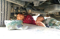 2015年6月8日驾驶员反馈车辆行驶向左跑偏,因洗车台高度不够无法用力松动前悬架调整螺栓做四轮定位调整,底盘江都宏业服务站站长方红业只能在跪姿的状态下来进行作业操作。