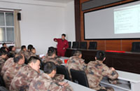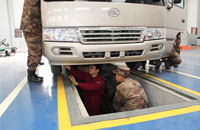 宝斯通车型的最大亮点:双横臂式带扭杆前独立悬架系统是宝斯通底盘的重要组成部分,也是体现宝斯通高品质和优异驾乘舒适性的关键,引起了修理营官兵的浓厚兴趣。图为江淮底盘技术人员在为修理营官兵进行实物讲解。