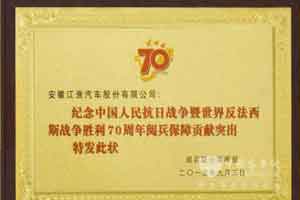 2015年9月6日,在装备方队指挥部技术服务队,两块金灿灿的阅兵保障突出贡献奖和装备保障先进单位荣誉奖牌被颁发给了江淮汽车公司阅兵服务保障大队,奖牌来自于阅兵联合指挥部和装备方队指挥部。手捧着奖牌,感受着荣誉,现场所有队员感受到了无尚的光荣,这不单是个人的荣誉,也是团队的一生荣耀。[详情]