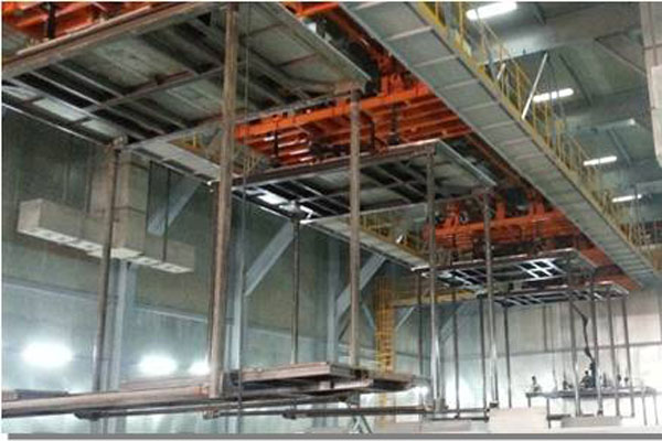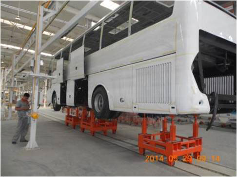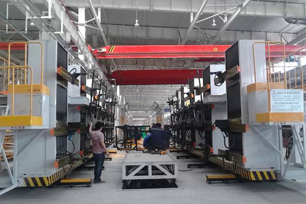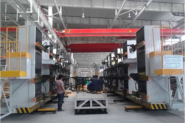 其中,焊装线车体流转采用双板链整体拉动输送,两侧涨拉蒙皮下料后采用空中自动输送。全部采用分离式生产,全承载车型采用漆后机装作业,全部投产后节拍时间7min。