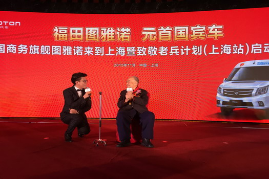2015年11月8日,德国商务旗舰图雅诺走进上海,开启上海站致敬抗战老兵计划。随着图雅诺保障抗战胜利70周年阅兵元首国宾接待任务的圆满完成,9月 22日福田汽车在北京正式启动致敬抗战老兵计划,之后在山东、浙江举行盛大的致敬抗战老兵活动。 此次,上海站致敬抗战老兵活动中,还特别邀请了功勋卓著的革命抗战老兵公进华讲述革命人生,图雅诺的德国商务旗舰品质同样吸引社会各界高度关注,引发中国制造接轨德国工业4.0的热议。