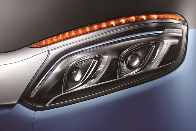 采用金龙特有的家族式前脸,与星钻异形LED高性能大灯交相辉映,整车设计践行意大利设计大师提出的“光影雕塑”设计理念,大气沉稳。