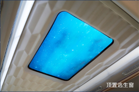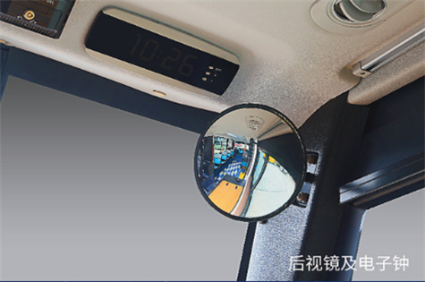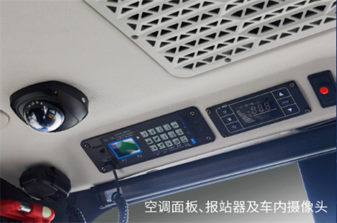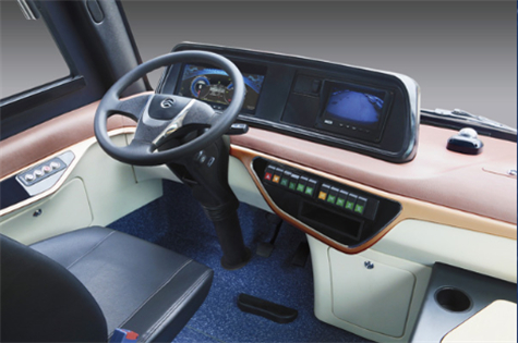 内饰采用轿车化设计,环抱式驾驶区、大面积覆皮仪表台、镀铬装饰件、全液晶仪表、自动挡按键等,凸显出整车的科技与高端。乘客区设计风格简约,色彩明快,装备电动塞拉门,气密性好,隔音隔尘效果更佳;32寸液晶一体机、大面积侧窗等人性化配置,带来更温馨舒适的乘坐环境。