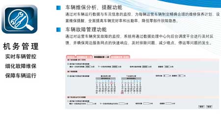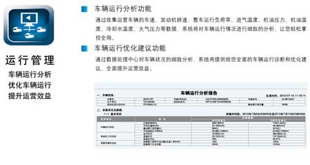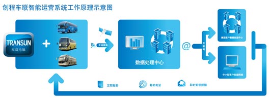 工作原理:“创程车联”智能运营系统通过车载智能终端从CAN总线、各类传感器上持续不断的采集发动机运行数据、车辆状况信息、驾驶员的操控行为,同时接收GPS卫星定位信息记录车辆所在位置,所有这些信息通过无线通讯实时传递到数据处理中心。数据处理中心通过商业智能技术将接收到的海量数据实时分析、整理,并以直观的报告、图表等形式展现出来。客户与集团调度中心即可使用独立账号从互联网在任何地方访问“创程车联”智能运营系统,及时了解车辆运行情况,从而制定相应的策略,更可随时向前段运营车辆发送各类指令,进行实时的调度管控。