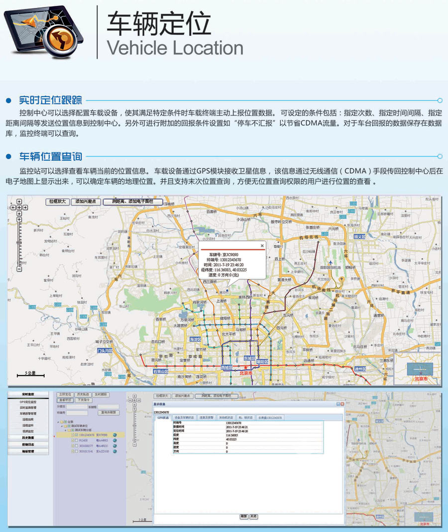 - 实时定位跟踪:控制中心可以选择配置车载设备,使其满足特定条件时车载终端主动上报位置数据。可设定的条件包括:指定次数、指定时间间隔、指定距离间隔等发送位置信息到控制中心。另外可进行附加的回报条件设置如“停车不汇报”以节省CDMA流量。对于车台回报的数据保存在数据库,监控终端可以查询。