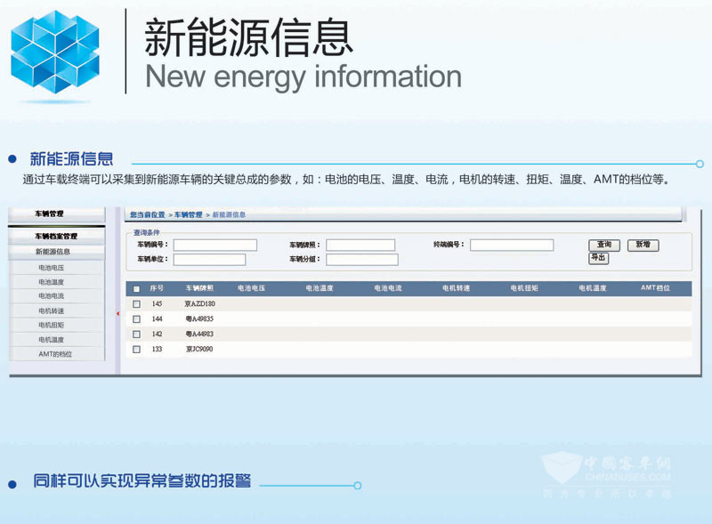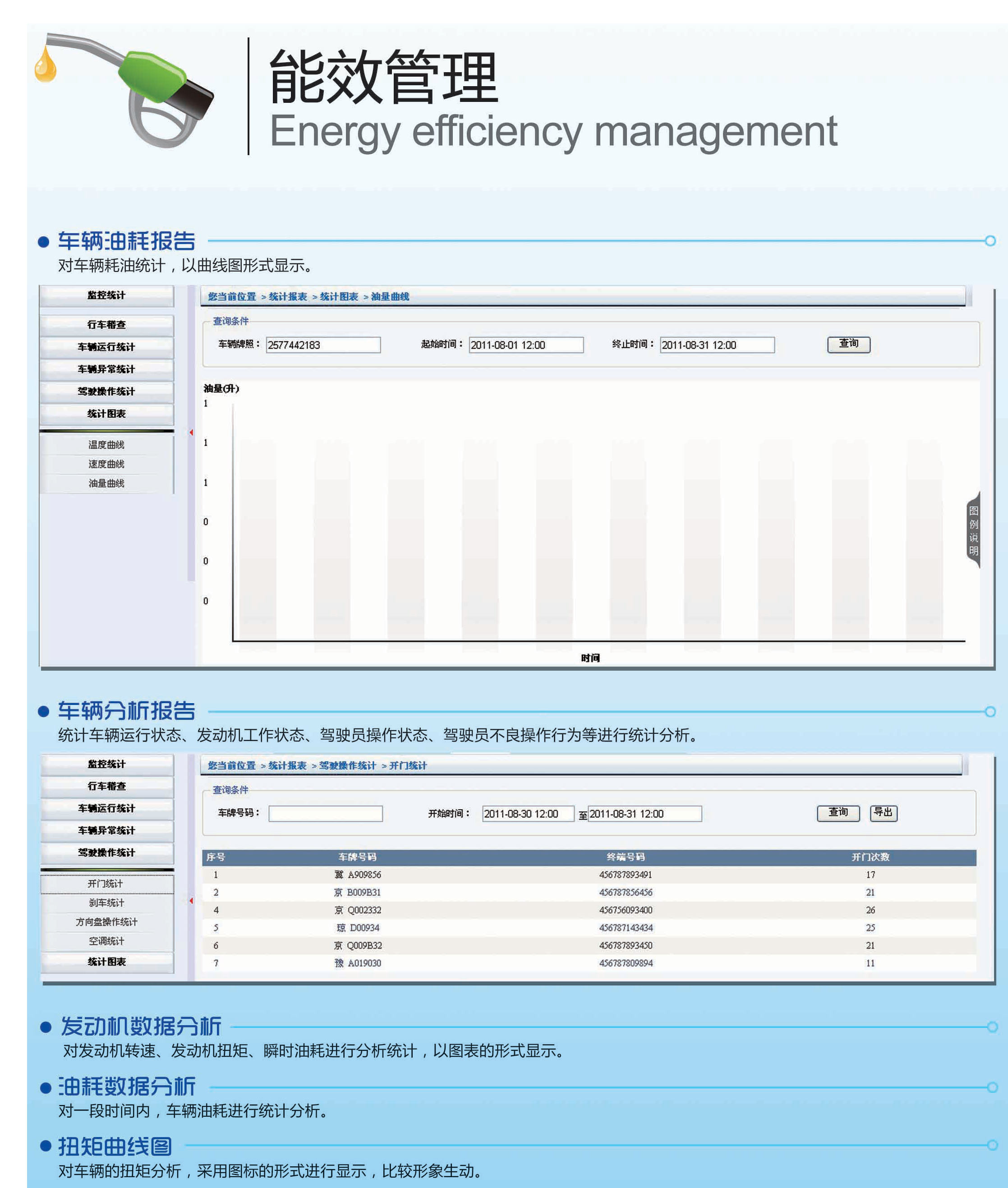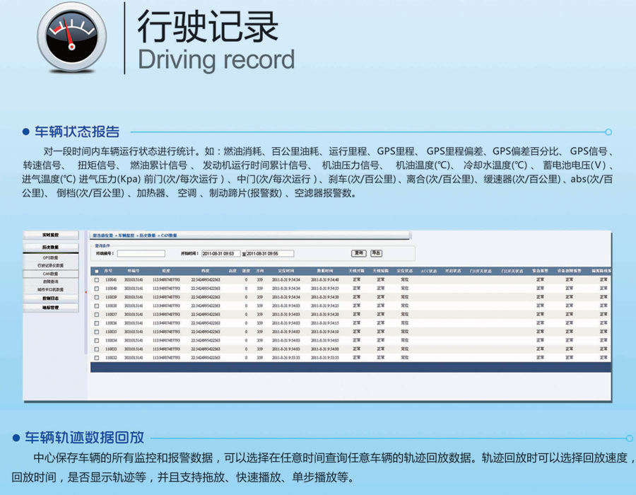 - 车辆状态报告:对一段时间内车辆运行状态进行统计,如:燃油消耗、百公里油耗、运行里程、GPS里程、 GPS里程偏差、GPS偏差百分比、 GPS信号、 转速信号、 扭矩信号、 燃油累计信号 、发动机运行时间累计信号、 机油压力信号、 机油温度(℃)、 冷却水温度(℃) 、蓄电池电压(V) 、进气温度(℃)和进气压力(Kpa)等。