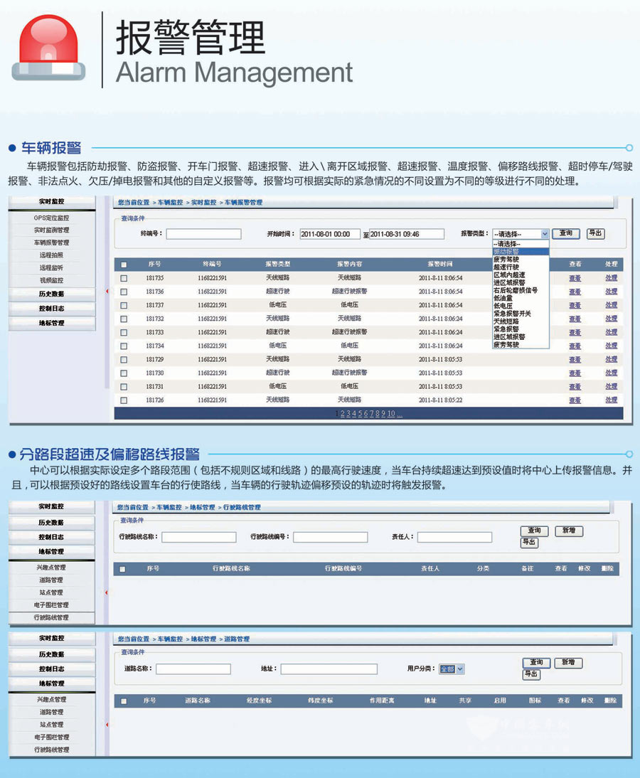 - 分路段超速及偏移路线报警是指中心可以根据实际设定多个路段范围的最高行驶速度,当车持续超速达到预设值时将中心上传报警信息。
