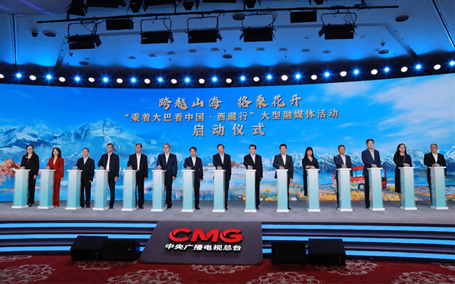 “发车!”2024年10月9日,中宣部副部长、中央广播电视总台台长慎海雄,北京市委常委、秘书长赵磊,西藏自治区党委常委、宣传部部长汪海洲,中国藏学研究中心总干事郑堆,北汽集团党委书记、董事长张建勇等共同启动“跨越山海 格桑花开——乘着大巴看中国·西藏行”大型融媒体活动。