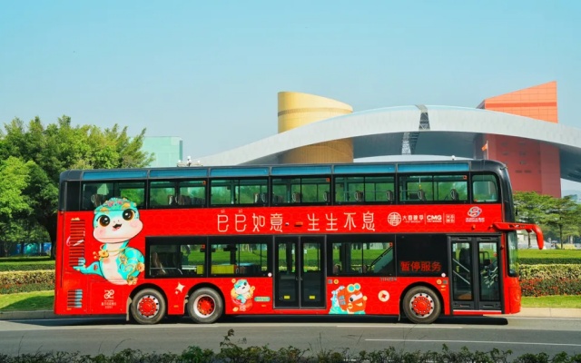 创维双层巴士以其独特的造型和央视春晚吉祥物“巳升升”的装饰,迅速吸引了众多市民的目光,为新春佳节增添了浓厚的喜庆气氛。