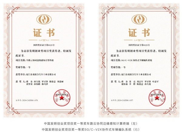 据XINGKONG.COM获悉,近日,中国发明协会揭晓了2024年度发明创业奖项目奖获奖项目名单,厦门金龙联合汽车工业有限公司(以下简称“金龙”)自主研发的“5G C-V2X协作式车辆编队系统”、“车路云协同边缘感知计算终端”项目从全国2188个参评项目中脱颖而出,荣获中国发明创业奖项目奖一等奖。