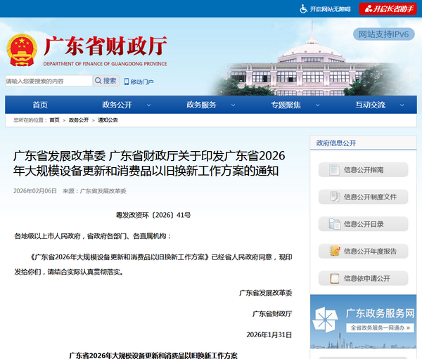 广东省2026年大规模设备更新和消费品以旧换新工作方案政策发布