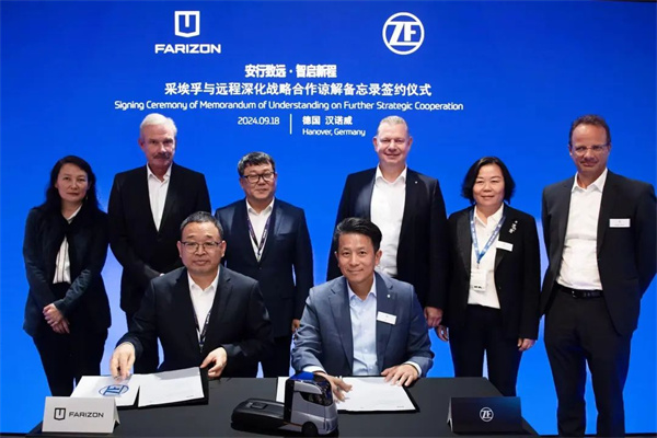 2024年9月18日,在德国汉诺威国际交通运输博览会(IAA)上,采埃孚与吉利远程新能源商用车集团签署合作备忘录,宣布扩大双方的战略合作伙伴关系。采埃孚集团商用车解决方案事业部亚太区销售副总裁李科与远程新能源商用车集团副总裁上官云飞分别代表双方签约。采埃孚集团董事、商用车解决方案事业部负责人彼得·莱尔教授、博士(Prof Dr Peter Laier),采埃孚集团高级副总裁、商用车解决方案事业部亚太区总裁于素杰,采埃孚集团高级副总裁、底盘控制产品线负责人菲利普·赫尔米希(Philipp Helmich),远程新能源商用车集团CEO范现军,全球技术总监Ulrich Richter,国际营销公司副总经理孙秀芹等领导共同见证了这一合作的全新里程碑。