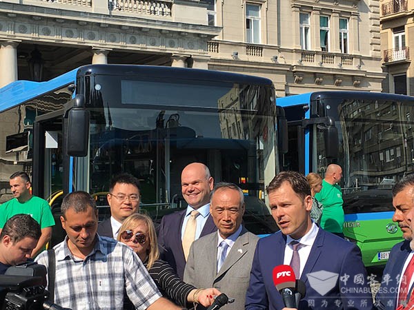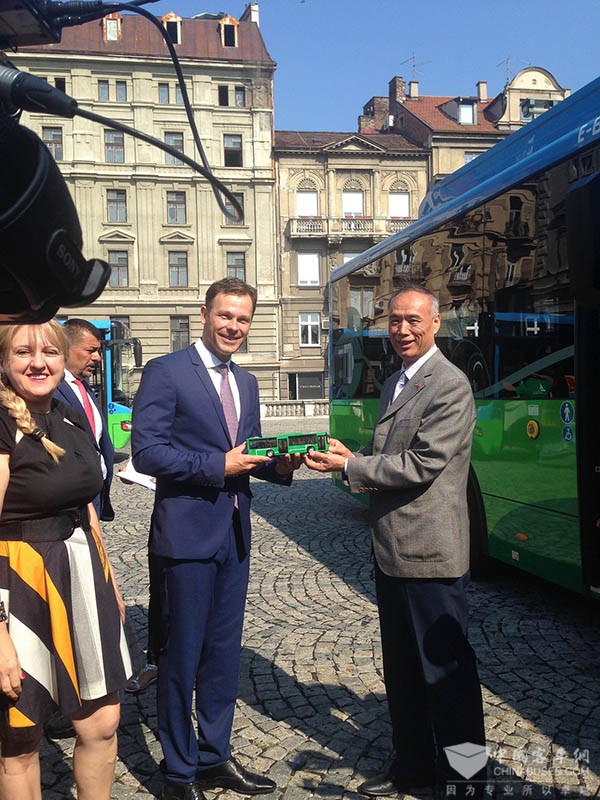上午9时整,贝尔格莱德市政厅外,市长辛尼萨、中国驻塞尔维亚大使李满长以及当地运营商和相关部门100余人参加新车上线首发仪式。仪式现场,李满长向辛尼萨赠送了苏州金龙车模。