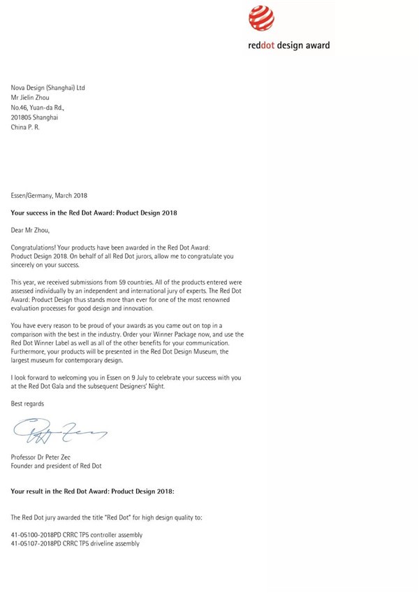 2018年4月9日,素有“工业设计奥斯卡”之称的红点设计大奖获奖名单公布,中车电动“T”动力电驱动系统,凭借独具创意的外观和突破性的设计与来自全球59个国家,6300余件产品激烈角逐,最终揽获两项"红点"产品设计大奖。这意味着继“iF国际工业设计奖”之后,中车电动再一次获得了国际的认可,乃全球新能源行业史上前所未有。
