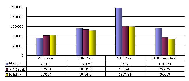 年初,从全国交通工作会议上得知: 2003年共完成交通基础设施投资3900亿元,同比增长12%,其中公路建设完成3500亿元,同比增长9%。2003年新增公路通车里程4.6万公里,其中新增高速公路4600公里,全国公路通车里程达到181万公里,其中高速公路近3万公里,实现了"五纵七横"国道主干线系统第一阶段建设目标。受交通部《收费公路车辆通行费车型划分》标准影响,39座客车将有可能成为2004年亮点。农村公路建设力度之大前所未有,全年共完成新改建农村公路10.2万公里;2004年新改建农村公路10万公里。公路建设的如此快速发展和交通基础设施投资之大,无疑为扩大公路客车市场提供了广阔前景。